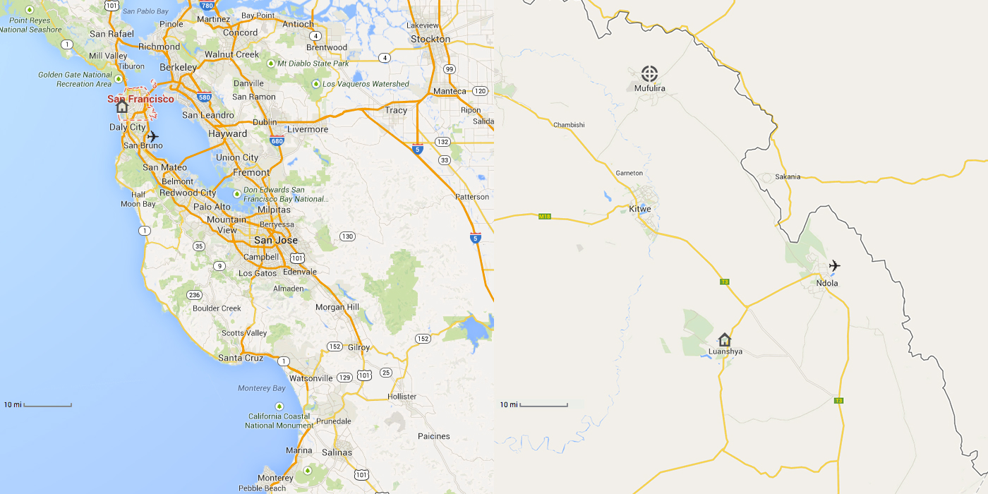 The San Francisco Bay Area compared with the area In Zambia where we will be leaving many footprints. | Zimbia the village is so small it’s not shown even on the closest zoom-in. The village is located near Mufulira. The team is staying at Kachele Farm . 20 minutes drive-time from Luanshya. We are landing and departing at Ndola.