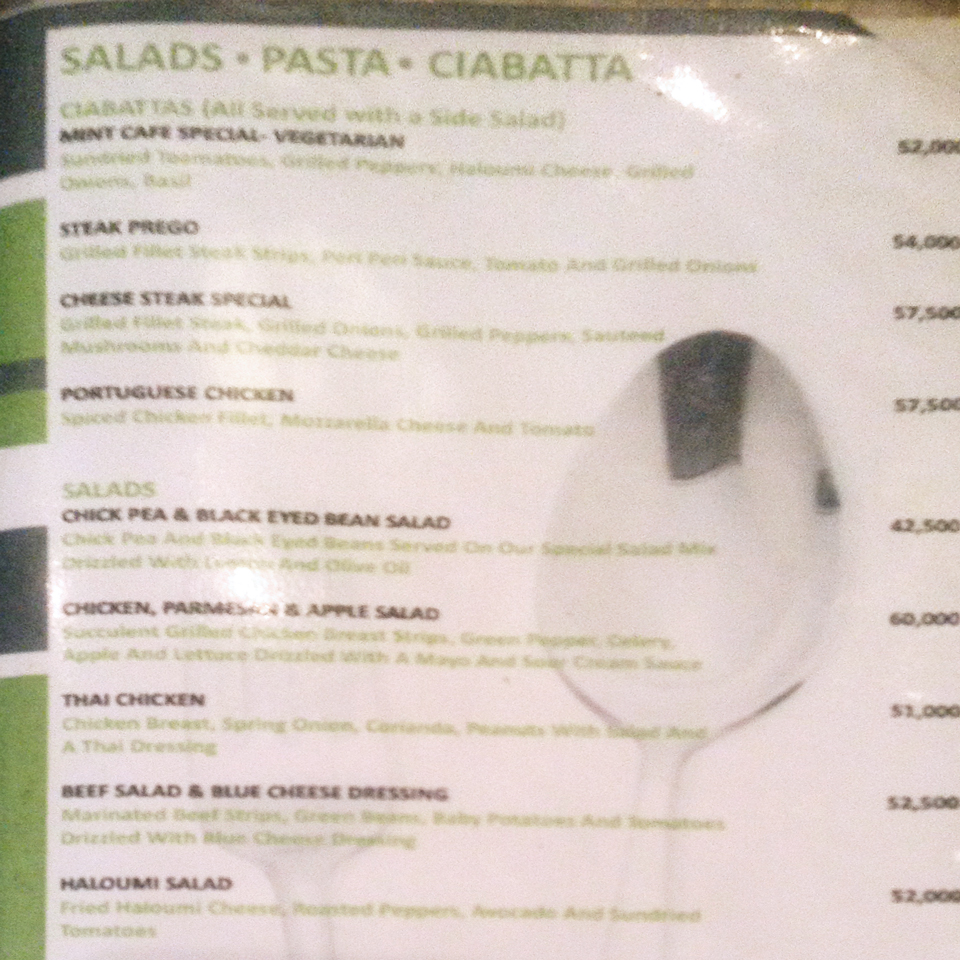 The Mint Café is located in a strip mall near a town called Ndola. As soon as I entered and read the menu, I had a surreal sensation that I was actually in a restaurant located in a typical Bay Area Asian strip mall because of the close resemblance of its decor and menu design. The differences were the wait staff was Zambian, and friendly with a cute sense of humor.