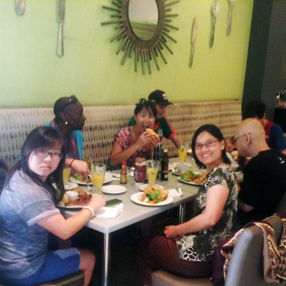 The team and Hands’ hosts Adam (blocked by Abe) and Delvin (in a baseball cap) enjoying lunch at The Mint Café. I assure you that Ichimwemwe was enjoying her food (beef steak), she was just having her usual camera face. 😉